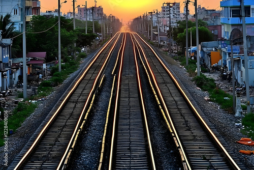 © Siasart Studio, Fototapeta premium Four parallel train tracks converge at sunset towards a distant vanishing point with surrounding buildings.