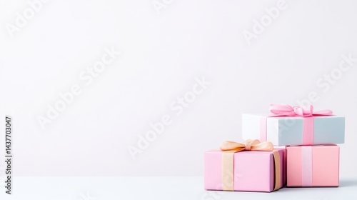 Obraz premium Four pastel-colored gift boxes with ribbons stacked on a clean white surface, minimalistic composition, soft lighting, and celebration concept.