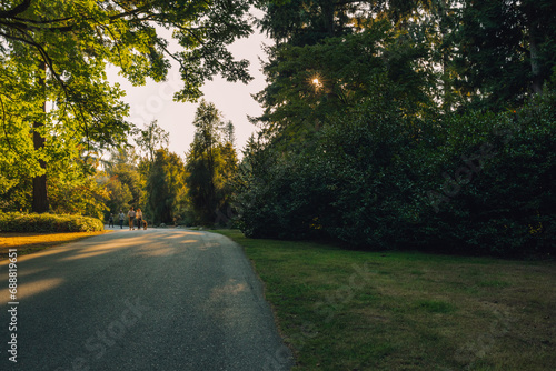 © Nicole Kandi, Obraz premium four people and a dog walking on footpath during an autumn sunset, sun rays shining through tree