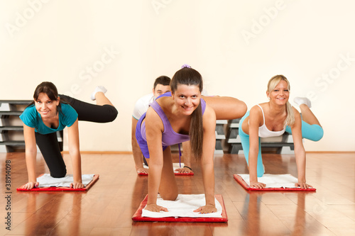 © luckybusiness, Naklejka premium four people is doing exercises in fitness club