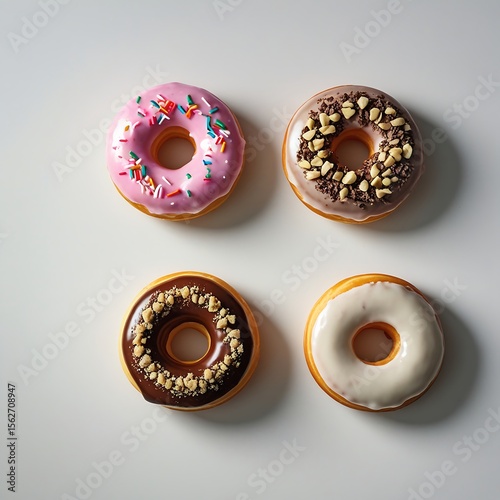 © MDFUAD, Fototapeta premium Four perfectly round donuts evenly spaced in a triangular arrangement directly on a plain white background—no props or plate. One has pink glaze with rainbow sprinkles.