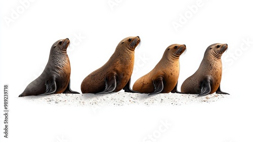 Fototapeta premium Four playful sea lions basking on the beach, showcasing their unique coats...