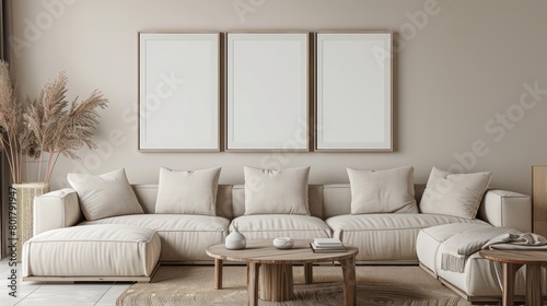 Naklejka premium four portrait picture frame mockup in office space