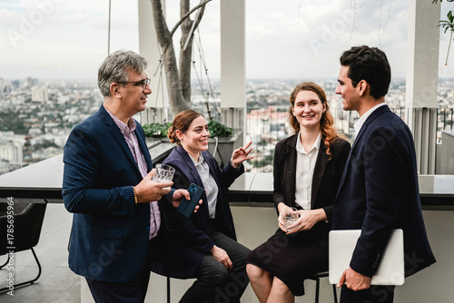 © artitwpd, Obraz premium Four professionals network on a rooftop terrace, sharing drinks and conversation with a city skyline in the background.