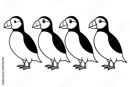 Fototapeta premium Four Puffins Linear Vector Art on White Background