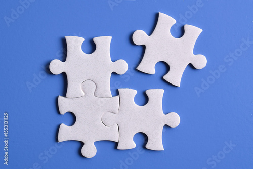 © Mulad Images, Obraz premium Four puzzle pieces on blue background. The concept of finding the right solutions in teamwork.