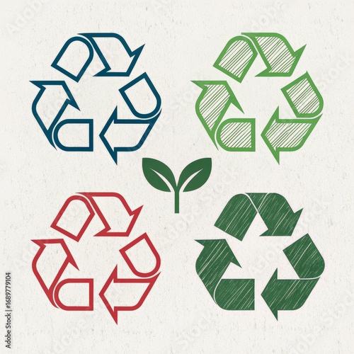 Obraz premium Four recycling symbols in different colors and styles on white background