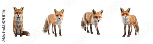 © Bilas AI, Fototapeta premium Four red foxes in various poses displaying natural beauty and curious expressions