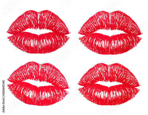 © TransPicHub, Obraz premium Four red lipstick kiss marks arranged in a grid pattern, showcasing lip texture and shape.