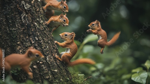 © Rere_Art151, Fototapeta premium Four Red Squirrels Playing on a Tree Trunk