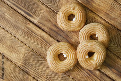 © slexp880, Obraz premium Four round rustic unglazed donuts with cream filling on a wooden diagonal background. Rustic table from pine boards. Close-up. copyspace