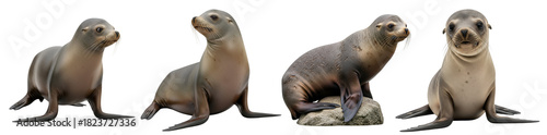 © Faizan, Naklejka premium Four sea lions in various poses isolated on a featureless plane showing their sleek fur and whiskers on transparent background