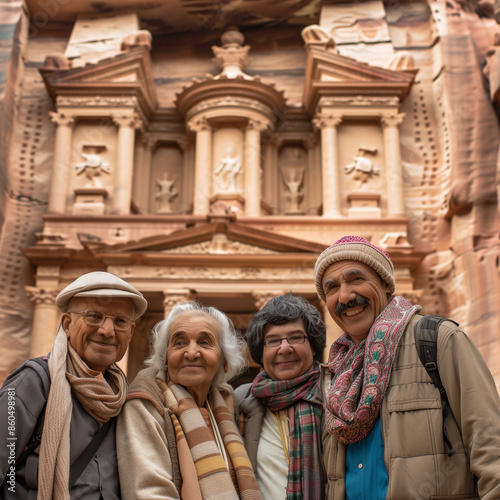 © javaistan, Naklejka premium Four senior people are posing for a photo in front of a petra building Jordan