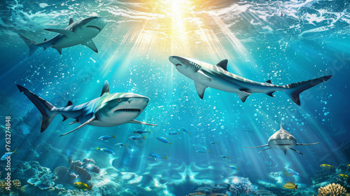 Fototapeta premium Four sharks are swimming under the ocean