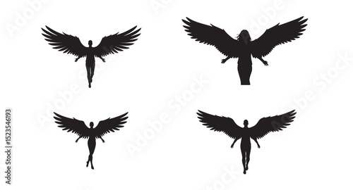 © Asif, Obraz premium Four silhouetted figures with large wings ascend, isolated on white background vector file