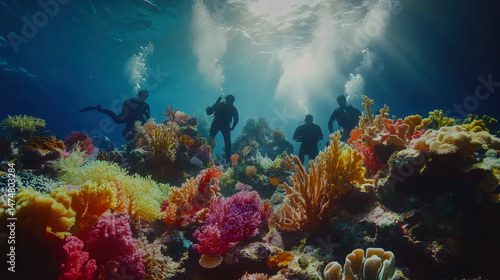 Naklejka premium Four silhouetted scuba divers swim gracefully above delicate fan corals,...