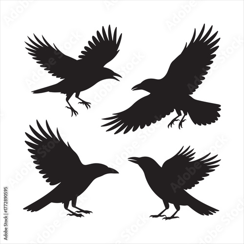 Obraz premium Four silhouettes of ravens in flight and perched against a white background
