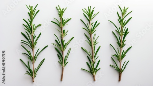 © Lasvu, Fototapeta premium Four sprigs of rosemary herb with green leaves and woody stems arranged in a row on a white background.