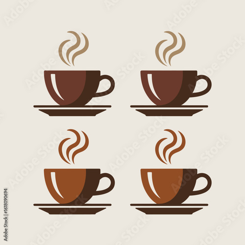 Obraz premium Four steaming cups of coffee on saucers in a flat design style