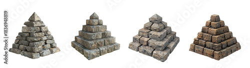 © Hirak, Obraz premium Four stone cairns or rock pyramids of different textures isolated on transparent background