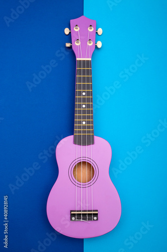 Obraz premium Four string ukulele guitar on blue background
