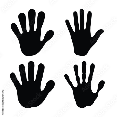 Fototapeta premium Four stylized black handprint silhouettes on a white background, symbolizing...