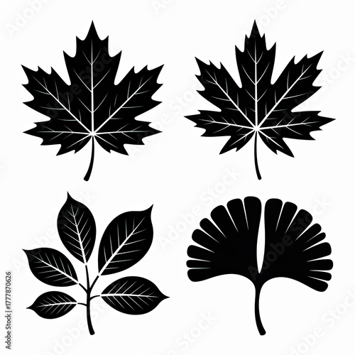 © Raheela, Fototapeta premium Four stylized black leaf silhouettes including a maple leaf, a horse chestnut leaf, a rowan leaf, and a ginkgo biloba leaf, all isolated on a white background.