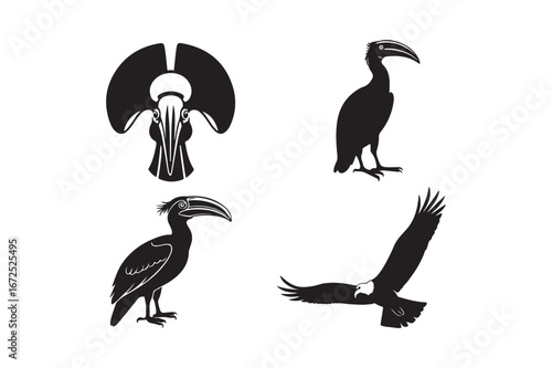 Obraz premium Four stylized black silhouettes of shoebill storks in various poses