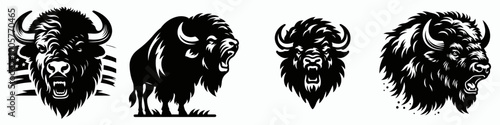 © Grapy Media, Obraz premium Four stylized buffalo illustrations in black and white, showcasing different expressions and angles.