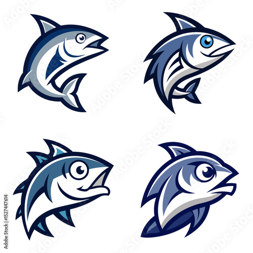 © VectorArt, Obraz premium Four stylized fish illustrations in blue and white with unique fin and body designs on white background