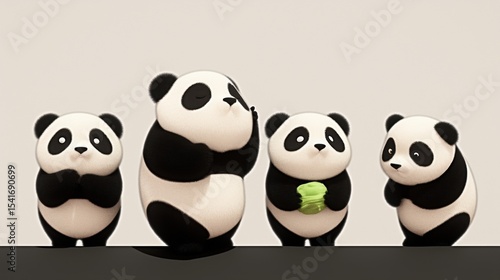 © 王二小, Fototapeta premium Four stylized panda figures standing in a row, one holding bamboo