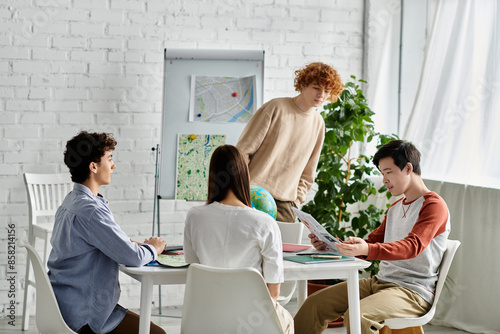 Obraz premium Four teenagers participate in a UN Model simulation, engaging in discussion...