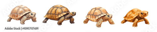 © Dorido, Obraz premium Four tortoises showcasing various sizes and stages of growth against a white background.