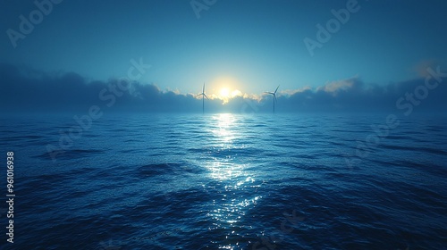 © tunanon, Fototapeta premium Four turbines spinning in harmony above the tranquil, reflective ocean waters.