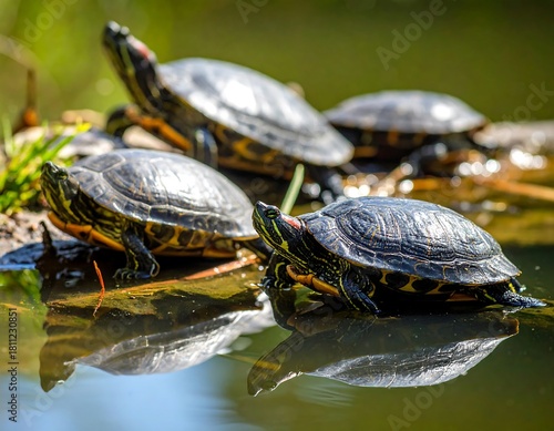 Fototapeta premium Four turtles bask in the sunlight near a tranquil body of water, their shells...