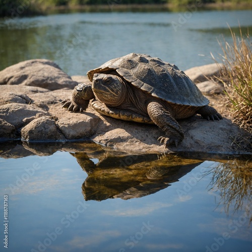 © Muhammad, Obraz premium Four turtles on a rock in Prospect Park.close up portrait shot of the curious turtle.Turtle sunbathing on a rock.