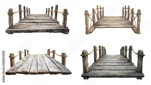 © อาริษา วันดี, Obraz premium Four Unique Designs of Rustic Wooden Piers Featuring Twisted Rope Railings with Natural Textures and Weathered Finishes Perfect for Scenic Backdrops, Waterfront Illustrations, and Outdoor Themes