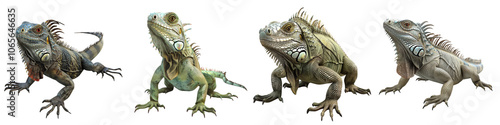 Fototapeta premium Four uniquely designed lizards in varying positions, showcasing intricate textures and colors on a white isolated background.