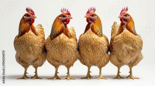 Fototapeta premium Four vibrant, healthy chickens standing in a row against a plain background,...