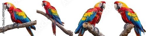 Fototapeta premium Four vibrant macaws perched on branches isolated on a white background,...