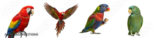 Fototapeta premium Four vibrant parrots showcasing diverse plumage and poses against a neutral setting well lit on transparent background