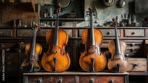Naklejka premium Four Violins Resting on an Antique Dresser