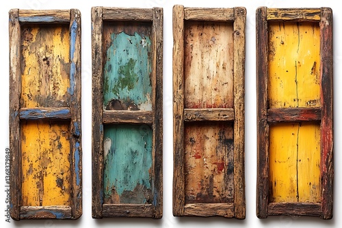 Naklejka premium Four weathered wooden panels displaying layers of aged paint and texture