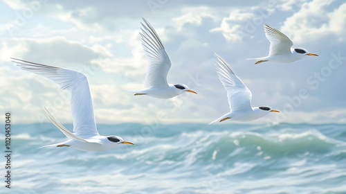 Obraz premium Four white birds flying over ocean waves under a cloudy sky.