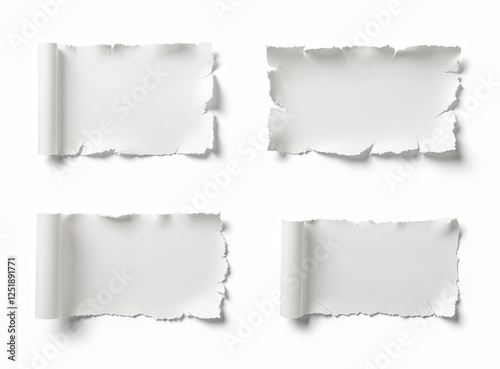 © miss irine, Obraz premium Four white ripped paper sheets isolated on transparent backdrop. Torn blank note papers look like parchment. Ragged cardboard for office message with empty space for text mockups.
