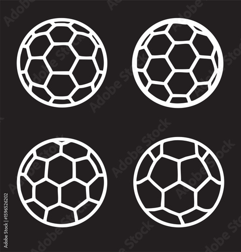 Fototapeta premium Four white soccer balls with hexagonal patterns on a black background