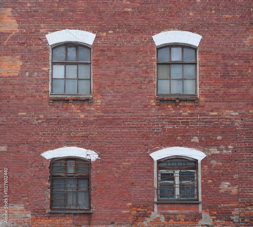 © Станислав Вершинин, Fototapeta premium Four windows in the old red brick wall