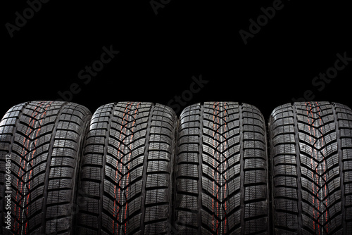Fototapeta premium Four winter tires standing on black background