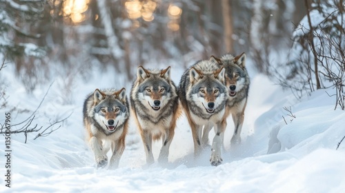 © Tuachan, Fototapeta premium Four Wolves Walking Together in a Snowy Forest Landscape
