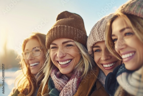 © Konstiantyn Zapylaie, Obraz premium Four women, bundled in winter attire, share warm smiles and laughter as the sun shines brightly behind them